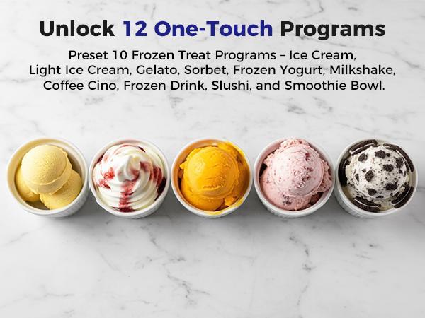 Master every frozen creation with twelve intelligent preset programs. Automatically optimize each cycle for smooth, delicious results. Choose from Ice Cream, Light Ice Cream, Gelato, Sorbet, Frozen Yogurt, Milkshake, Coffee Cino, Frozen Drink, Slushie, Smoothie Bowl, Mix-in, and Self-Clean modes.