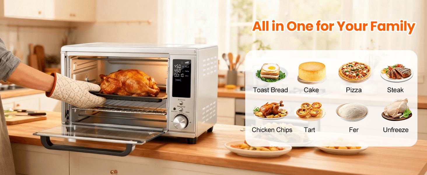 This oven is suitable for various cooking needs. Whether you want to air fry, toast, or bake, this appliance has you covered. The included accessories make it even more versatile. Perfect for any kitchen.