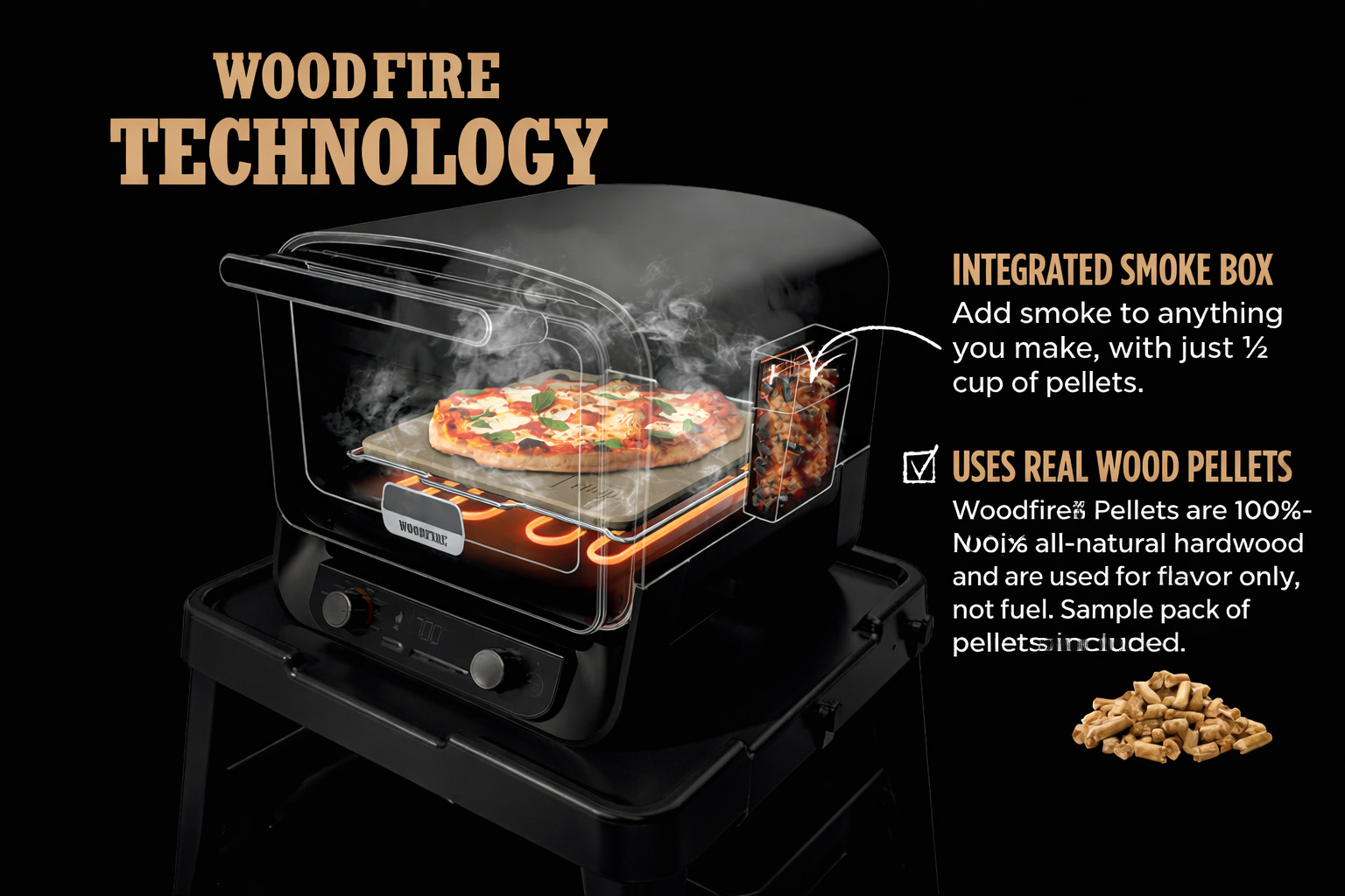 Create 12-inch pizzas in just 3 minutes with 5 preset modes, and enjoy authentic woodfire flavor at any temperature using just 1/2 cup of pellets. Perfect for feeding a crowd with space for a 12-lb turkey or full meals.