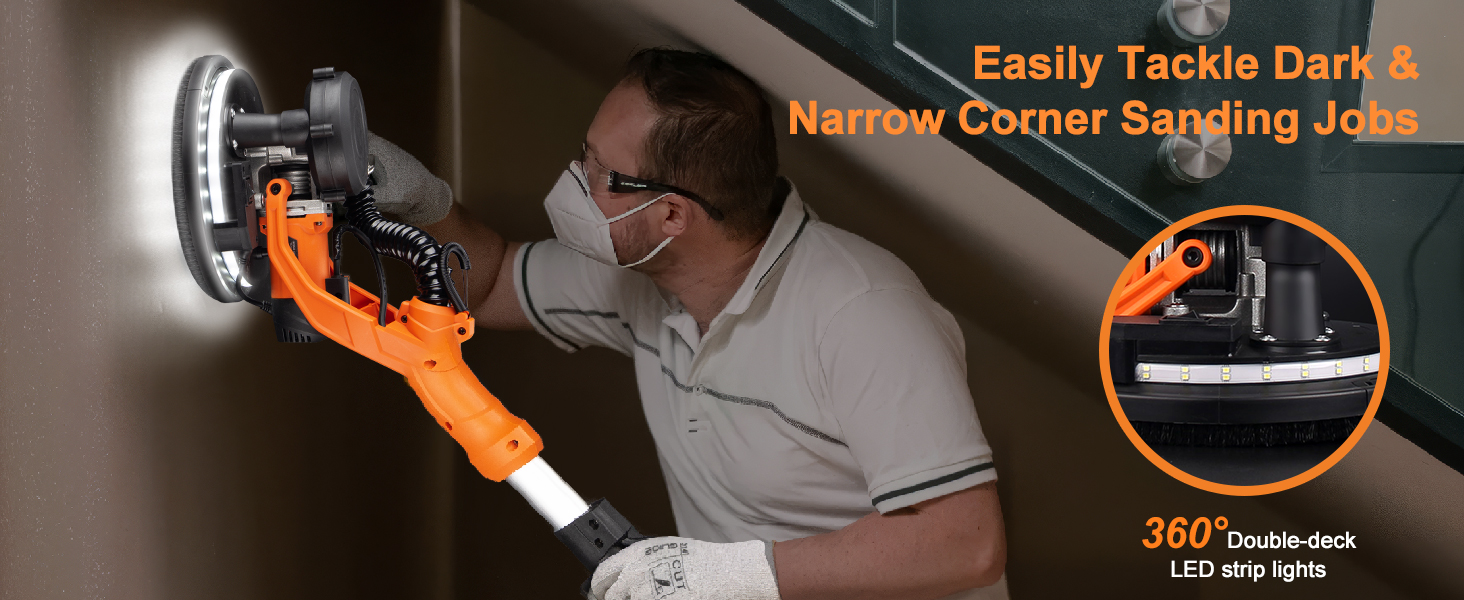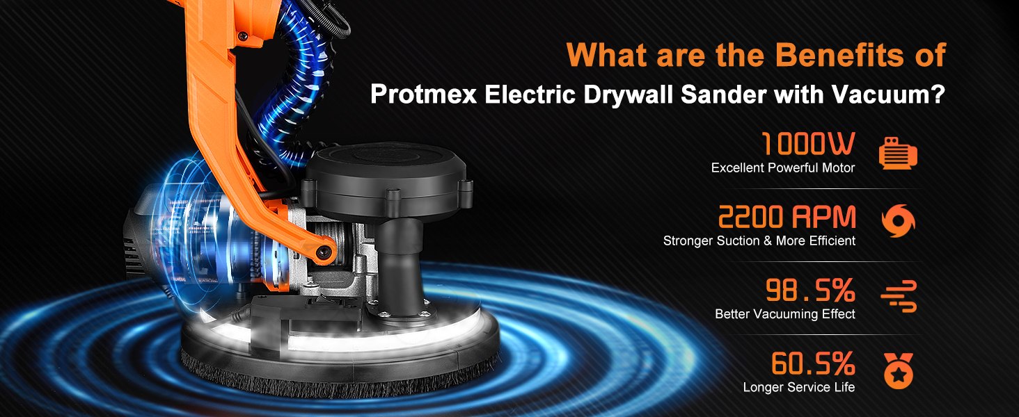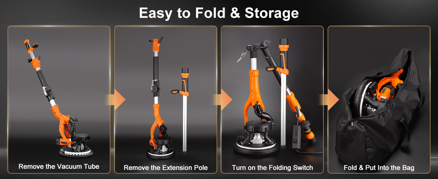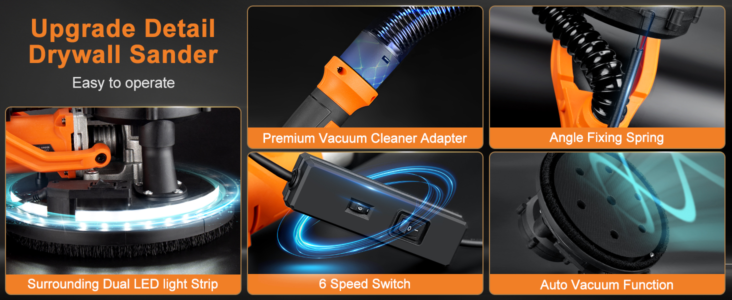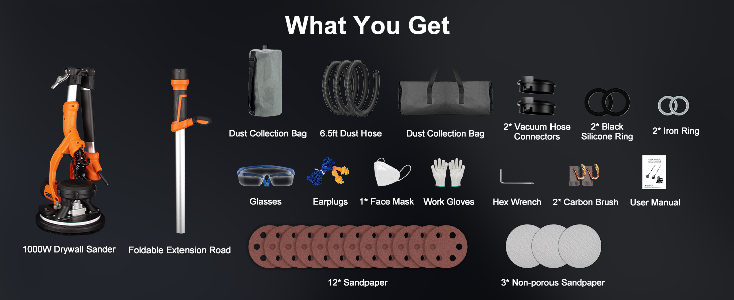 🧰 What's in the Box:Core Machine & Accessories:1.1000W Drywall Sander /2.Foldable Extension RodDust Collection & Tubing Accessories:3.Dust Collection Bag /4.6.5ft Dust Hose/5.Dust Collection Bag/6.2 Vacuum Hose Connectors*/7.2 Black Silicone Rings*/8.2 Iron Rings*Personal Protective Equipment;9.Safety Glasses/10.Earplugs/11.1 Face Mask*/12.Work GlovesTools & Consumables:13.Hex Wrench/14.2 Carbon Brushes*/15.User Manual/16.12 Sandpapers/17.3 Non-porous Sandpapers*The dust collection system is compatible with most household/industrial vacuum cleaners, enabling dust-free sanding right out of the box.