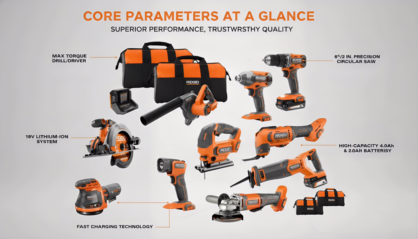 This RIDGID combo kit features the drill/driver, impact driver, 6-1/2 in. circular saw, reciprocating saw, jig saw, angle grinder, oscillating multi-tool, random orbit sander, compact jobsite blower, LED worklight, 2.0Ah battery, and 4.0Ah battery and charger.